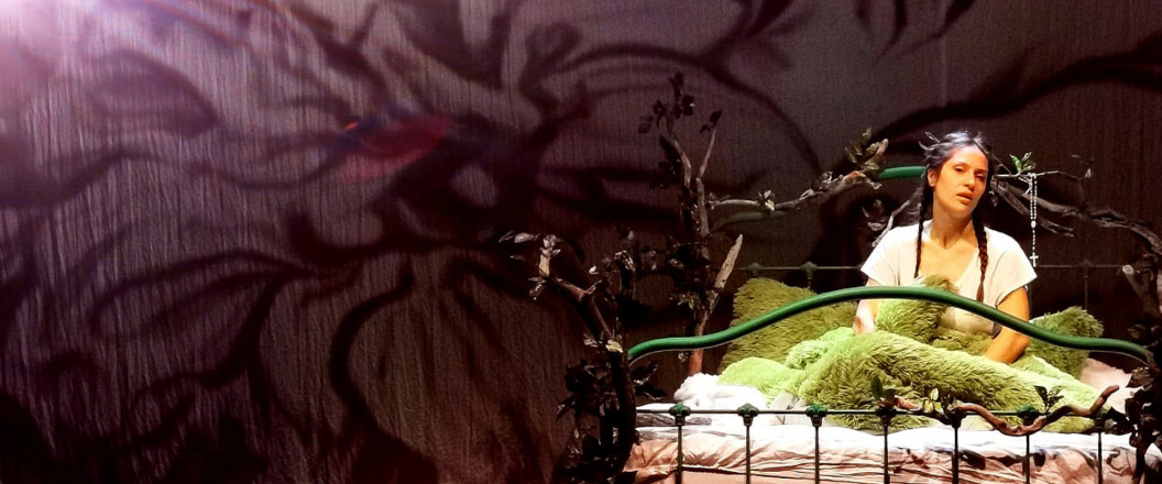 Le chapitre final d’Ulysse de James Joyce, dit « Monologue de Molly Bloom », est l’une des voix intérieures qui ont jusque-là le plus ému et intéressé Claire Angenot. Elle en propose une adaptation qu’elle interprète elle-même, avec l’intention de poursuivre sa recherche de Master à Paris 3 sur la représentation de la psyché dans les nouvelles technologies. Dans une chambre peu réaliste, envahie par la végétation et par les vidéos oniriques créées par Maëlla-Mickaëlle Maréchal, présente avec elle au plateau, elle nous livre une parole féminine et intime qui se déploie comme un rhizome.
